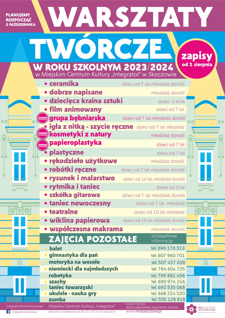 To idealny moment, by rozwijać swoje zainteresowania! Zapraszamy na organizowane w MCK "Integrator" : WARSZTATY TWÓRCZE i ZAJĘCIA POZOSTAŁE dla dzieci, młodzieży i dorosłych w sezonie 2023/2024.